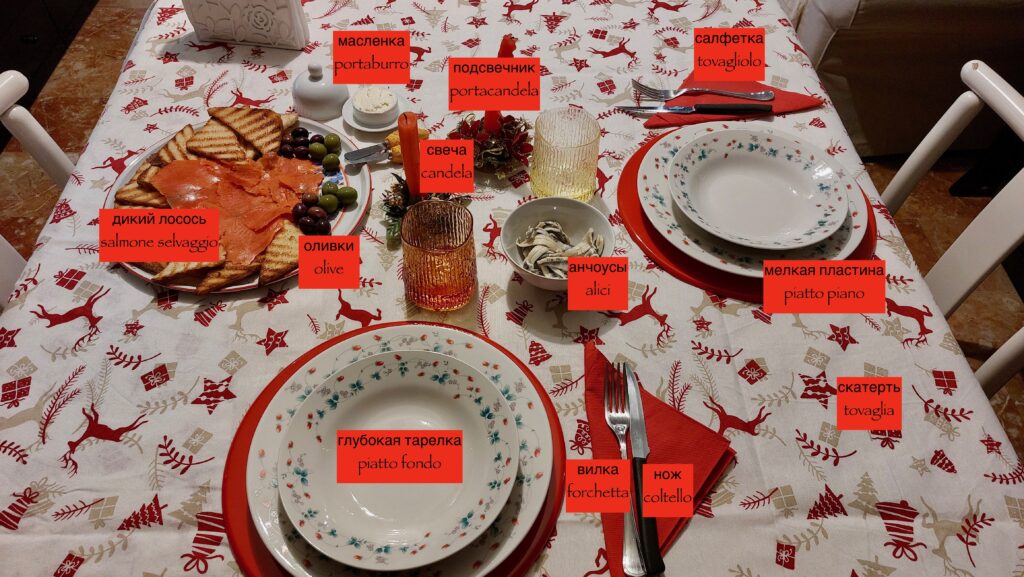 Il Post di oggi fa un po’ da apripista per i prossimi, perché inizieremo a ripassare i verbi di moto, con prefissi e senza. Pronti? Intanto impariamo qualche nuovo vocabolo che può sempre tornarci utile. Nella foto di copertina c’è la mia tavola imbandita in un giorno di feste natalizie. Anche in questo caso, il mio è solo un spunto per ripassare vocaboli che sicuramente potranno tornarci utili alla prossima cena in compagnia, magari di amici russi!