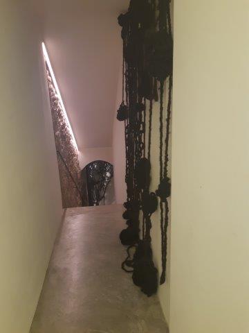 Percorrendo le diverse stanze buie che caratterizzano il percorso della mostra di The dark side, si arriva ad una rampa di scale che conduce al piano inferiore della mostra. La rampa e lo stretto corridoio sono tinteggiate di un bianco splendente su cui spiccano nere installazioni intrecciate. A primo acchito si scambiano per innumerevoli corde aggrovigliate, in realtà, sono capelli, capelli umani. Lunghissime file di capelli che scendono copiose dal soffitto o che si snodano lungo le pareti circondano il visitatore che prosegue con inquietudine verso nelle altre sale della mostra.
