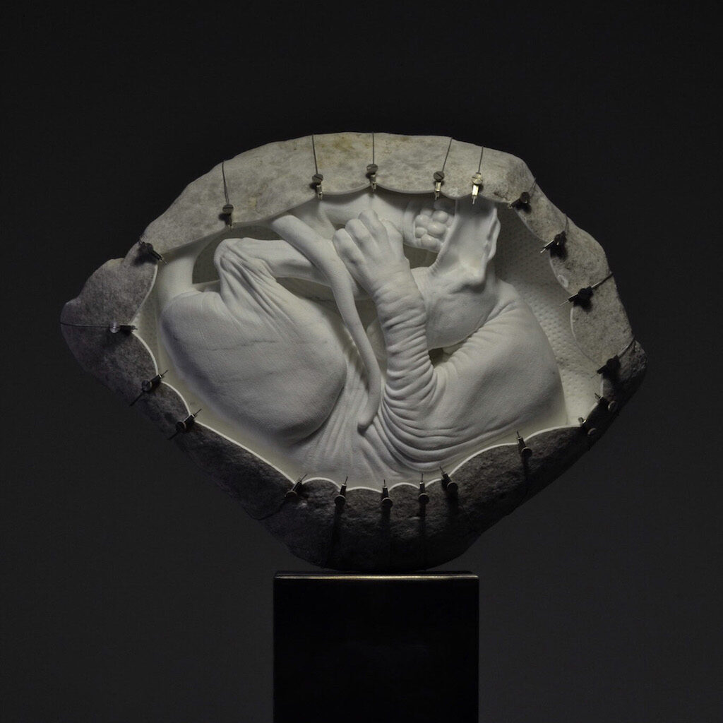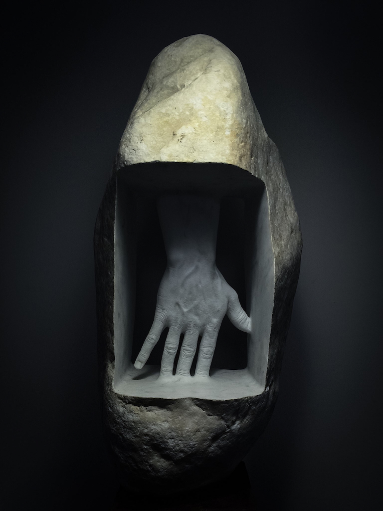 Prima testimonianza è lo scavo sui grandi sassi raccolti nel greto di un fiume alle pendici delle Alpi Apuane, pazientemente scavati nel desiderio di raccontare una storia personale e umana. Pietà e violenza si intrecciano nello sguardo del giovane artista. Sorprendente è la scardinante nudità del Pontefice emerito, mentre l’immagine di una Venere (2018), priva della venustà giovanile, sconcerta e induce a riflettere.